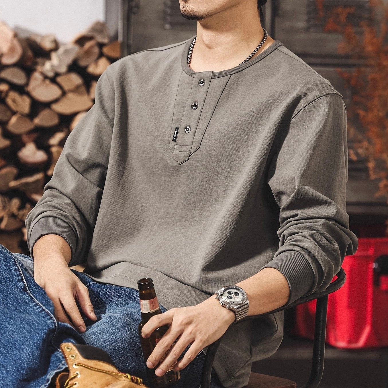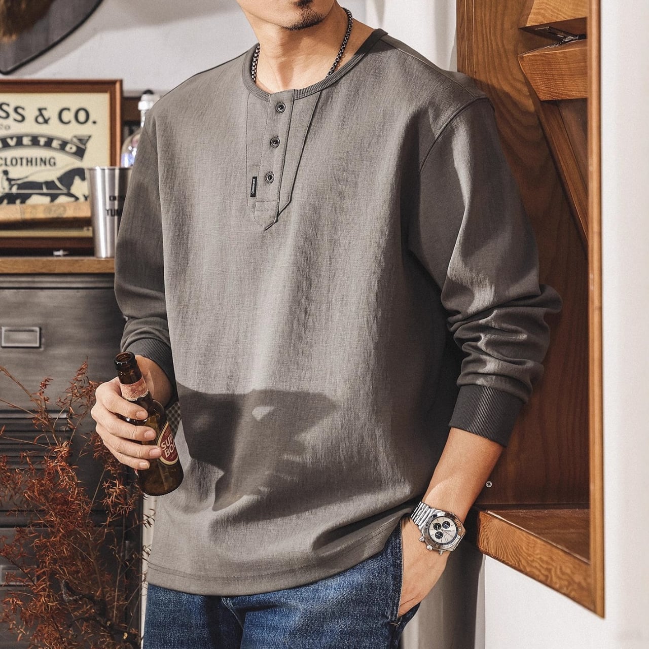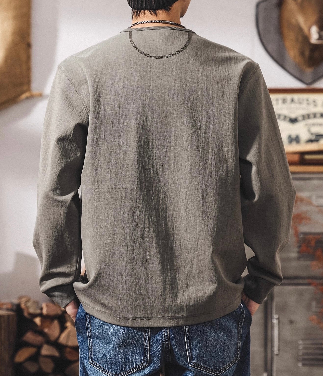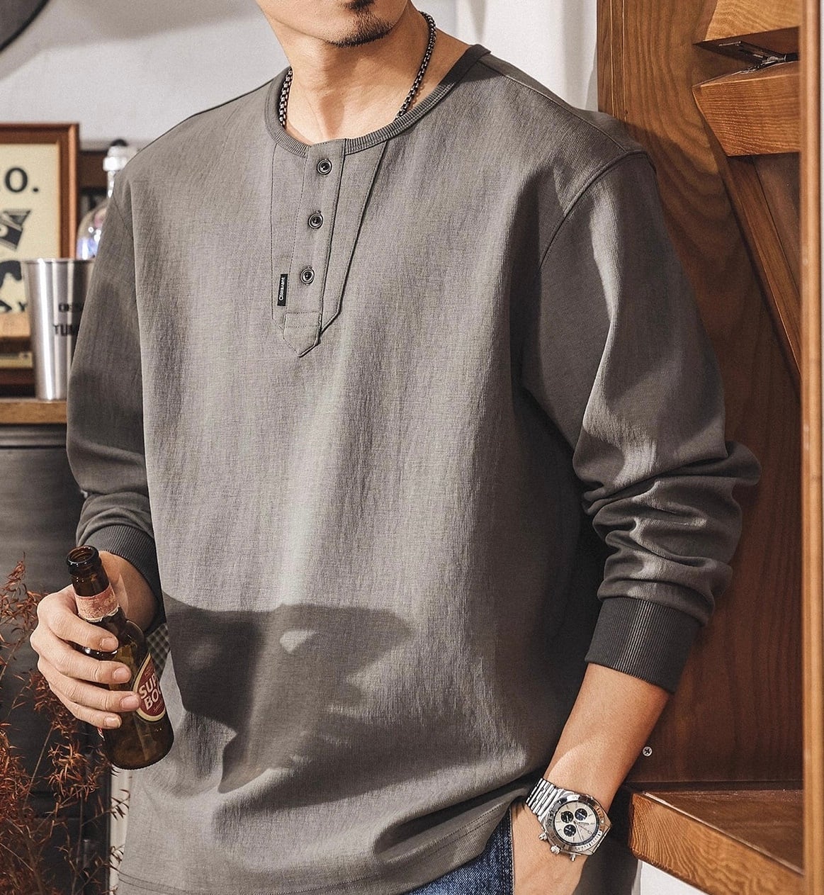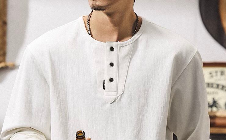Henley neck heavy long t shirt ( 3color )