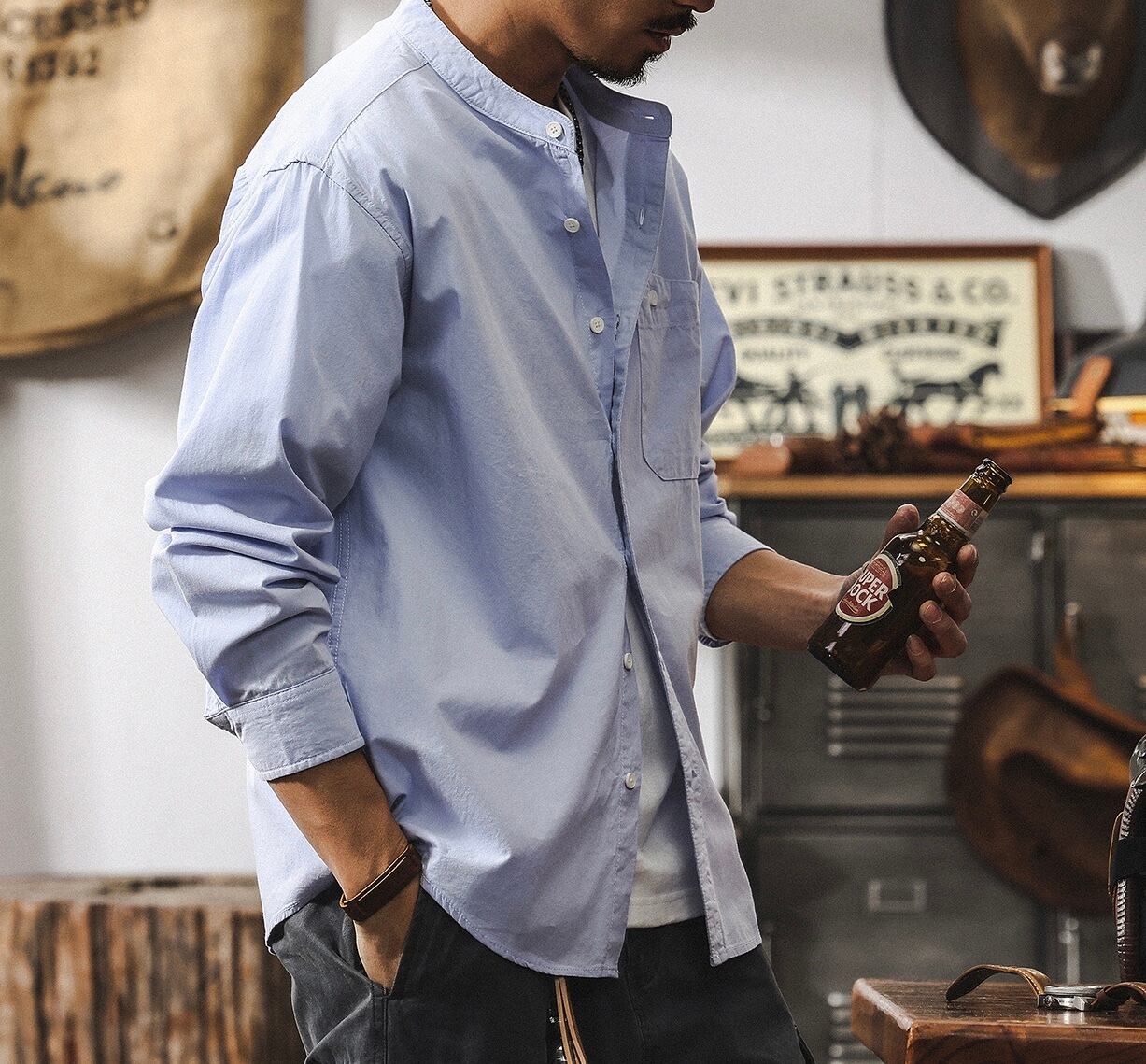 Stand collar single pocket retro shirt ( 2color )