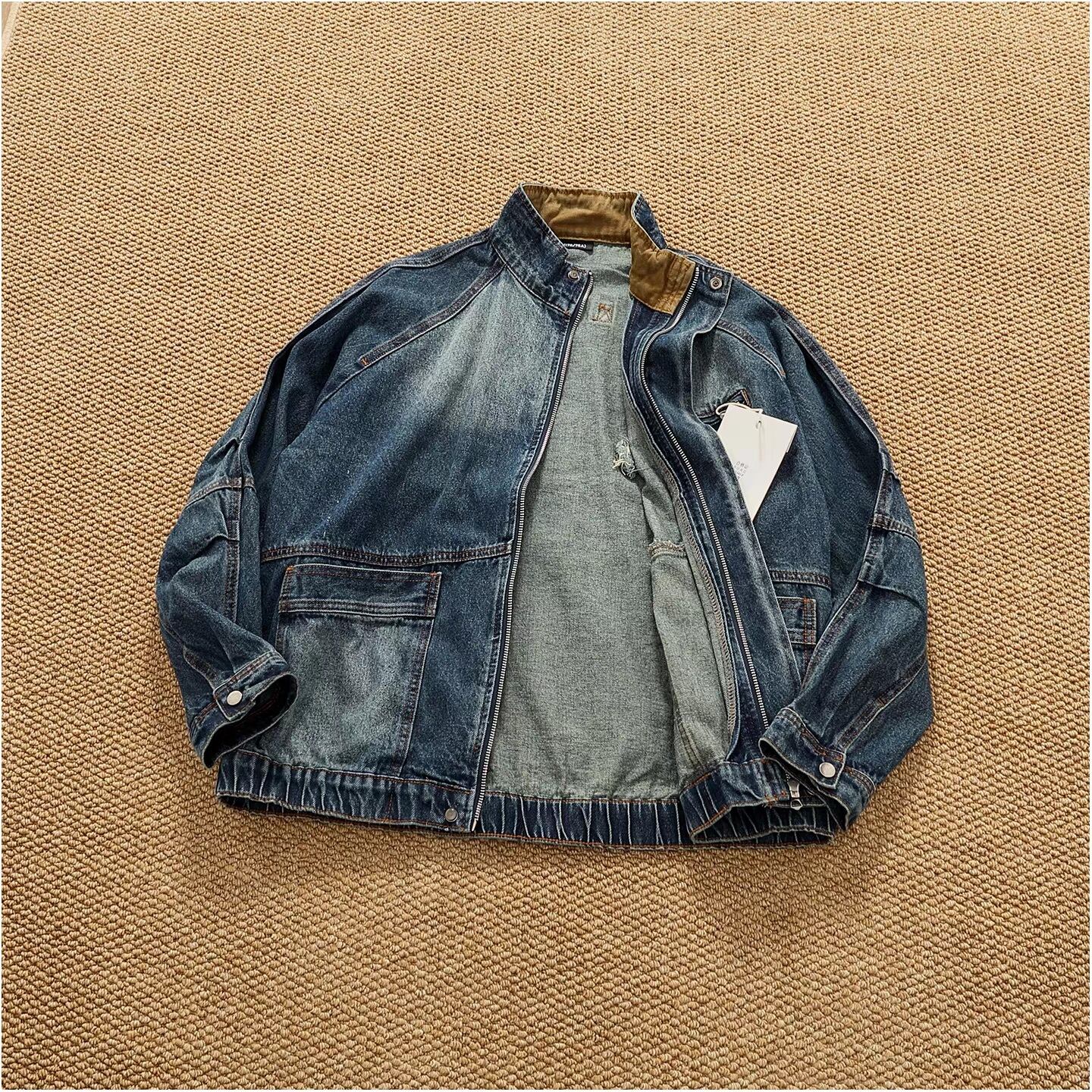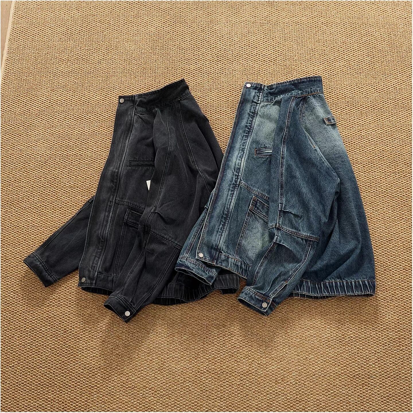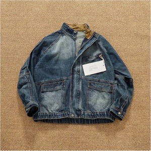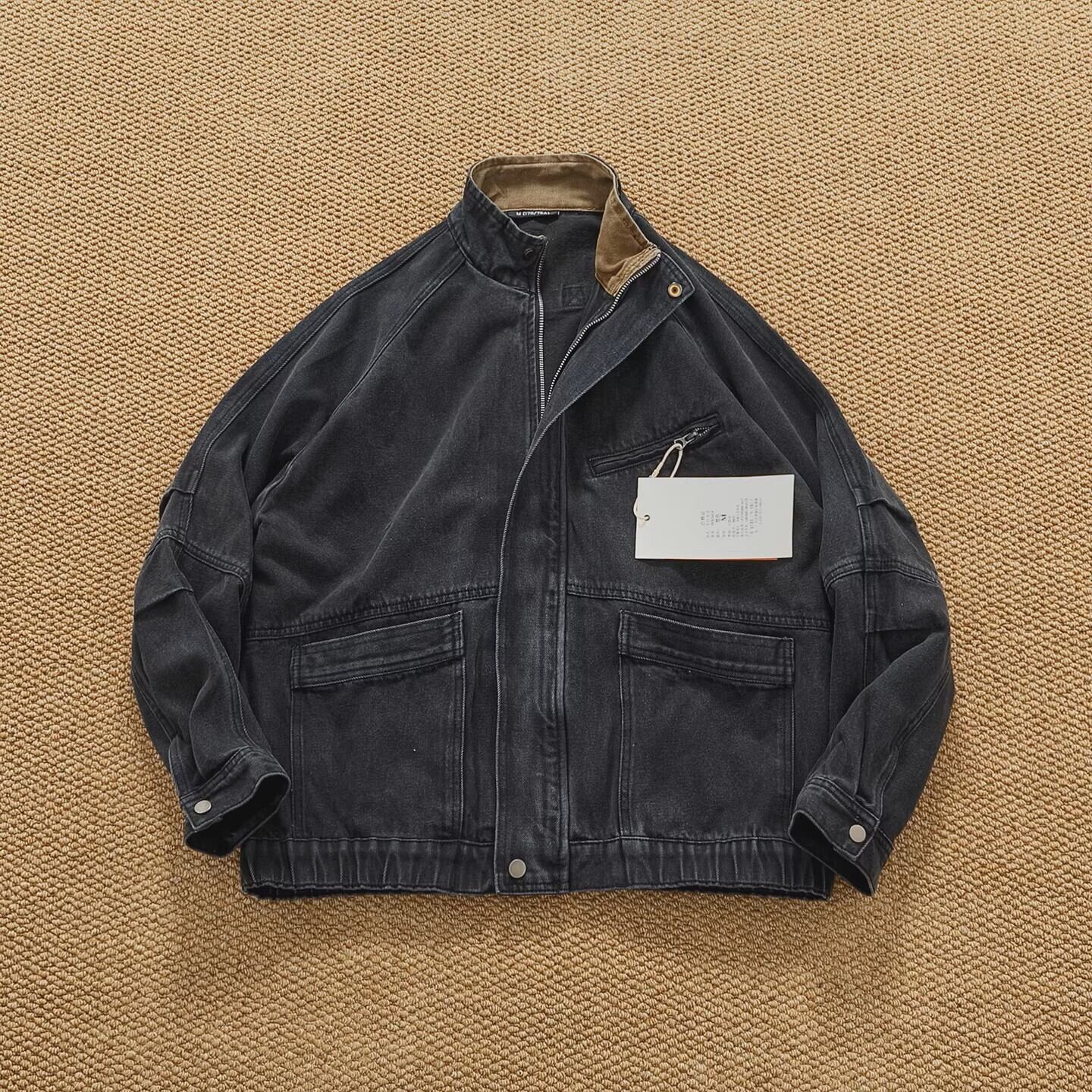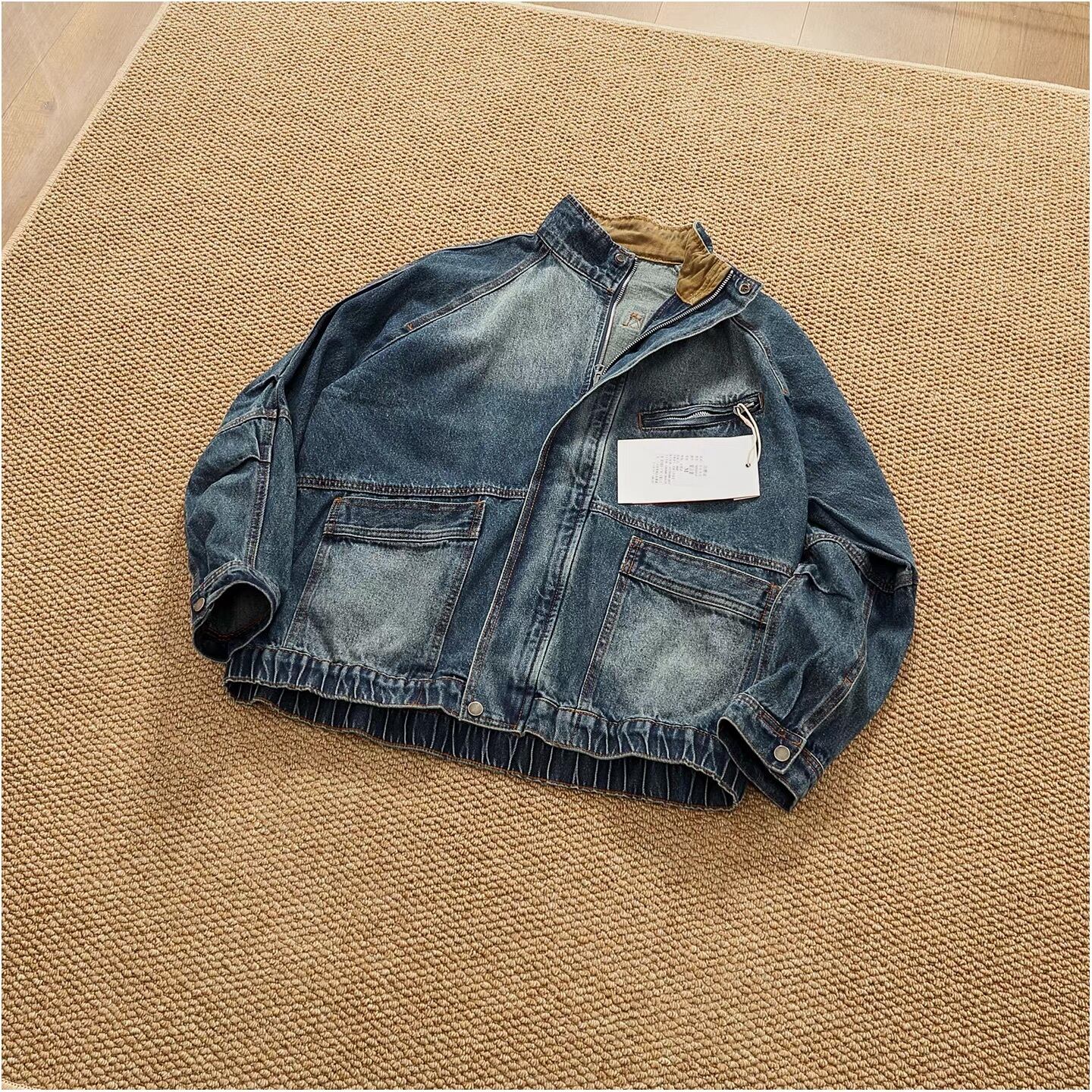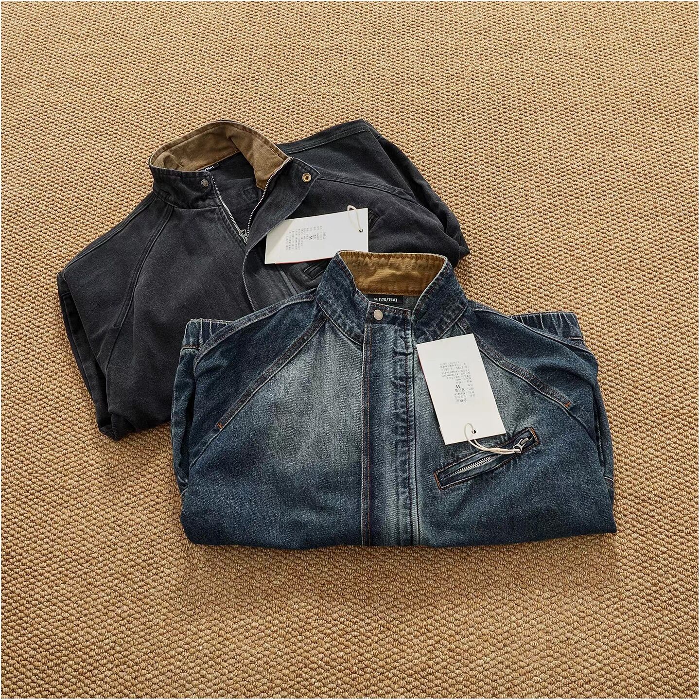 Stand collar vintage wash double pocket denim jacket ( 2color )