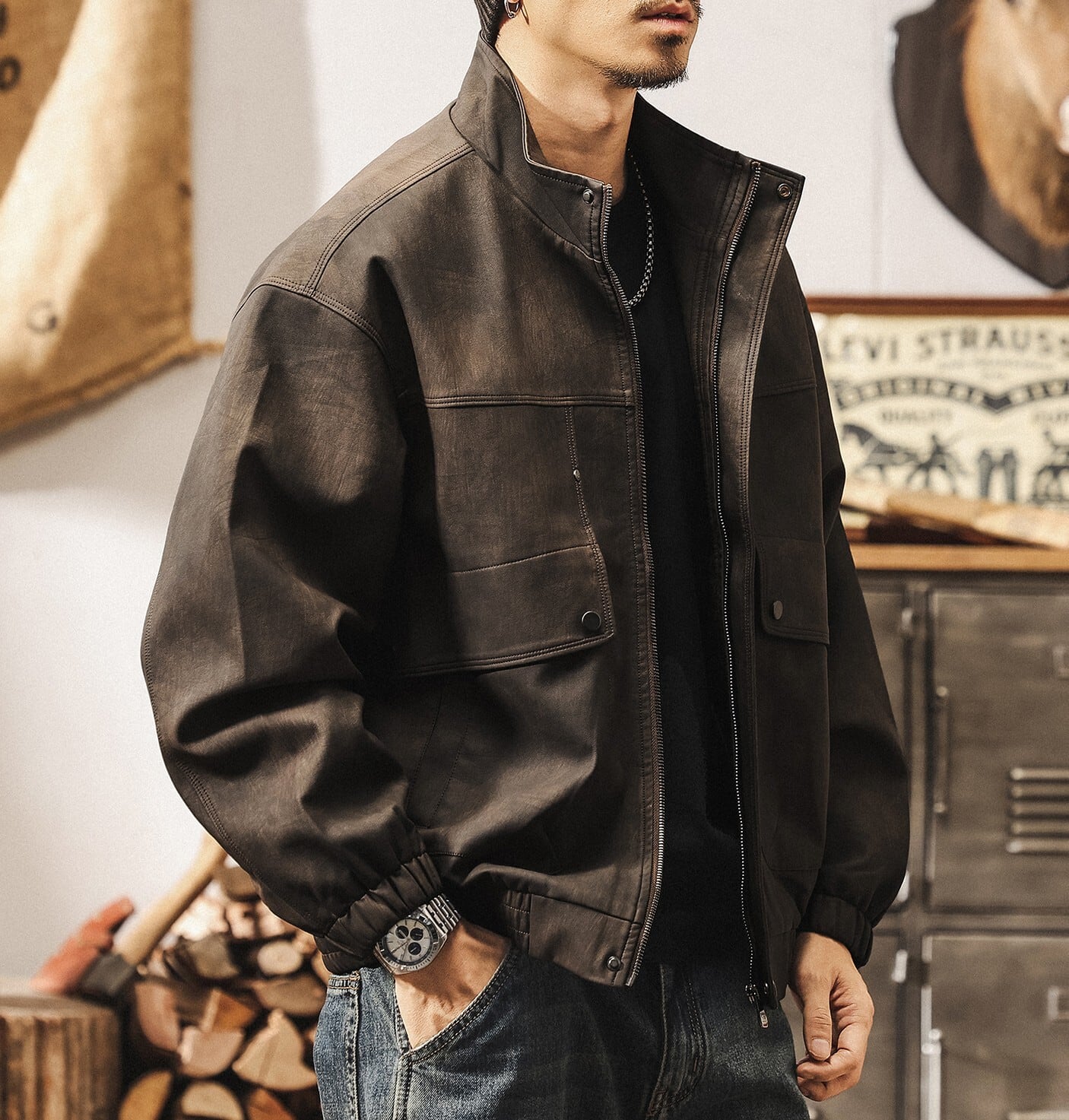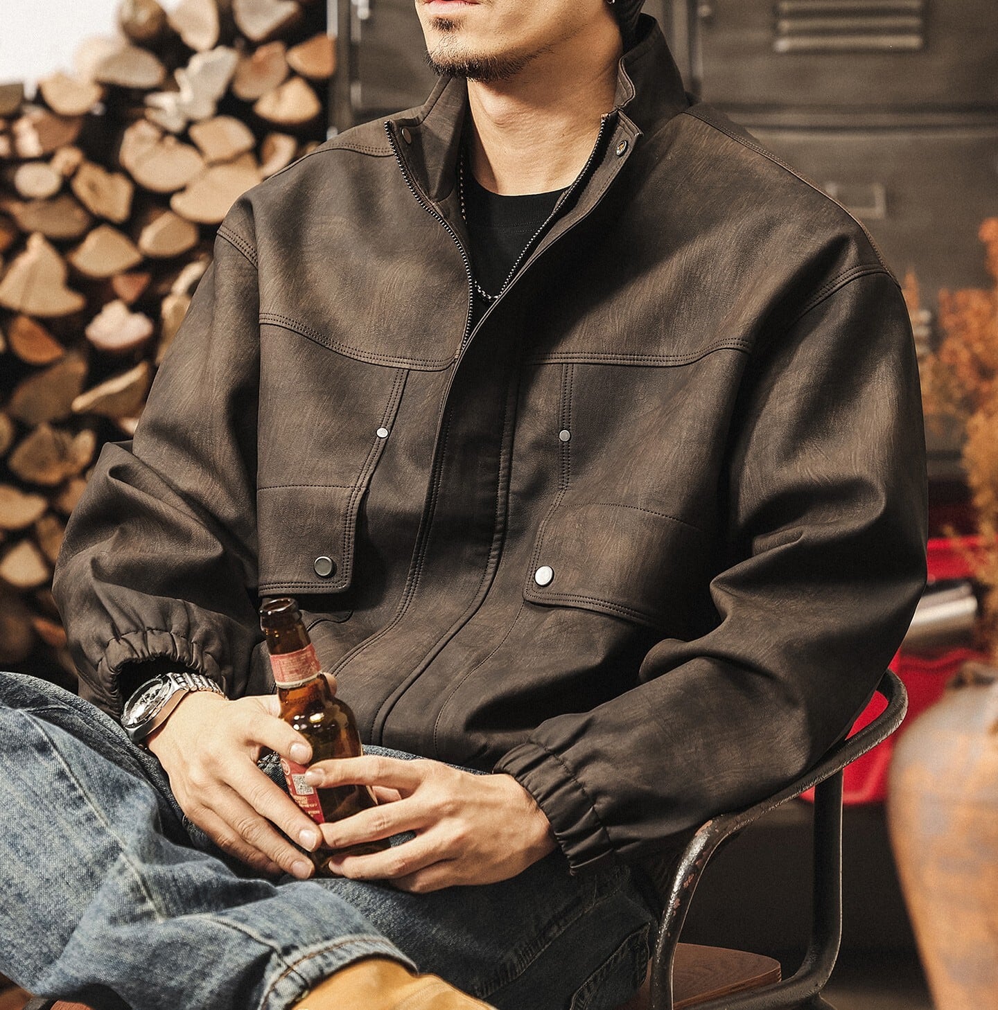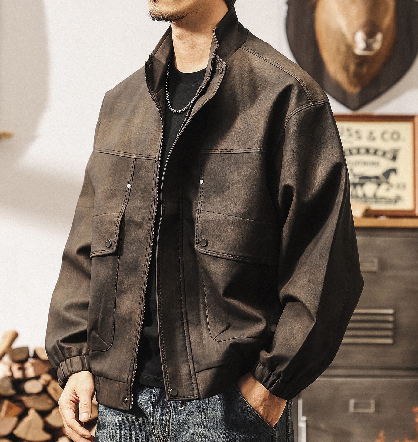 Stand collar matte pu leather vintage jacket ( 2color )