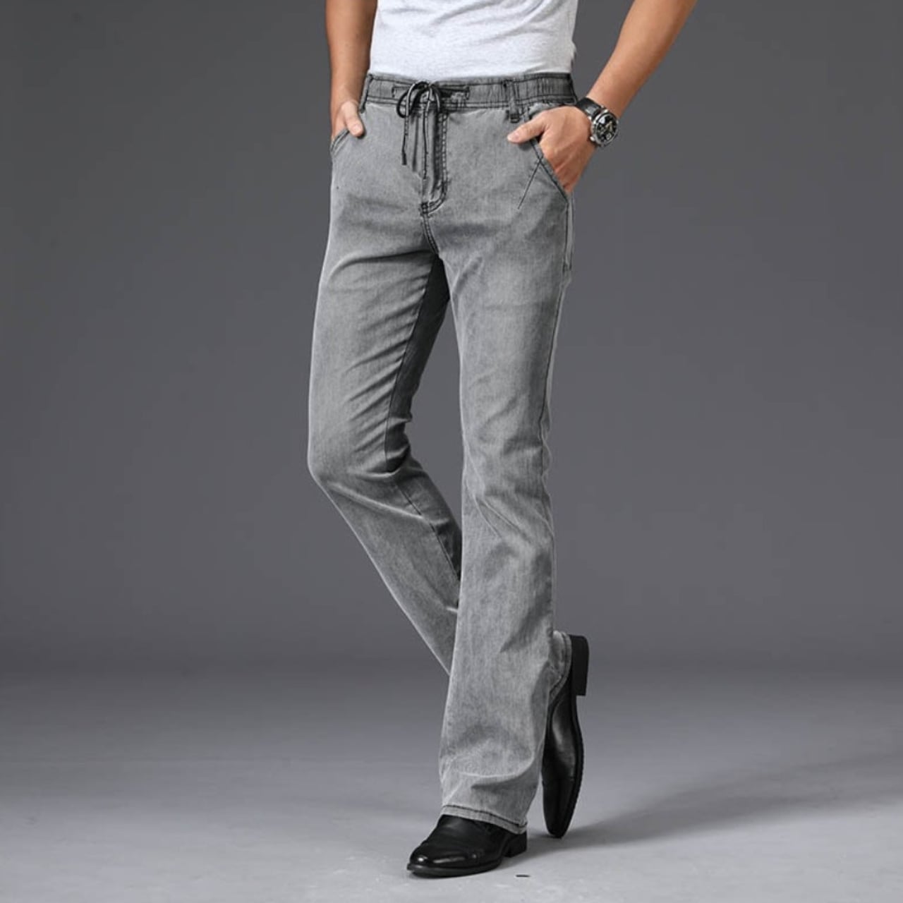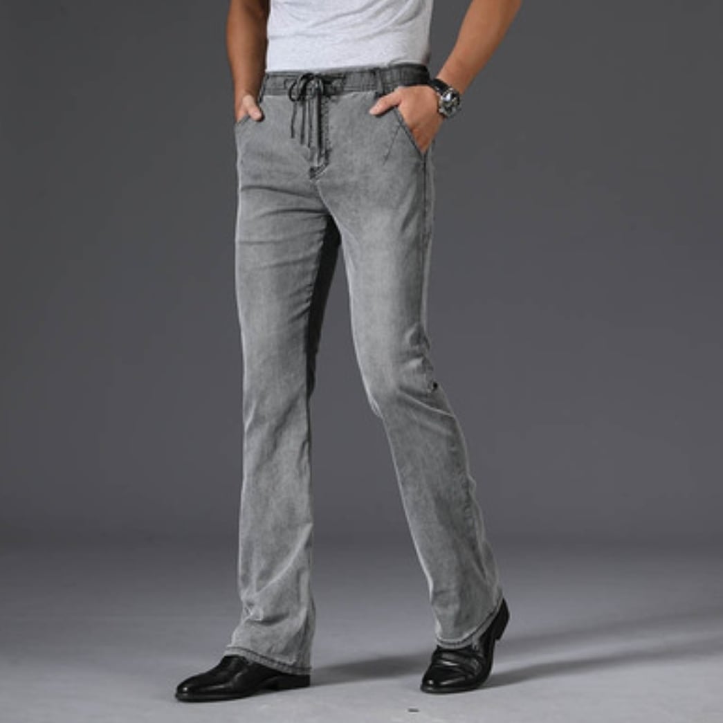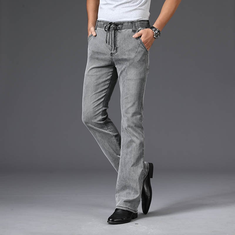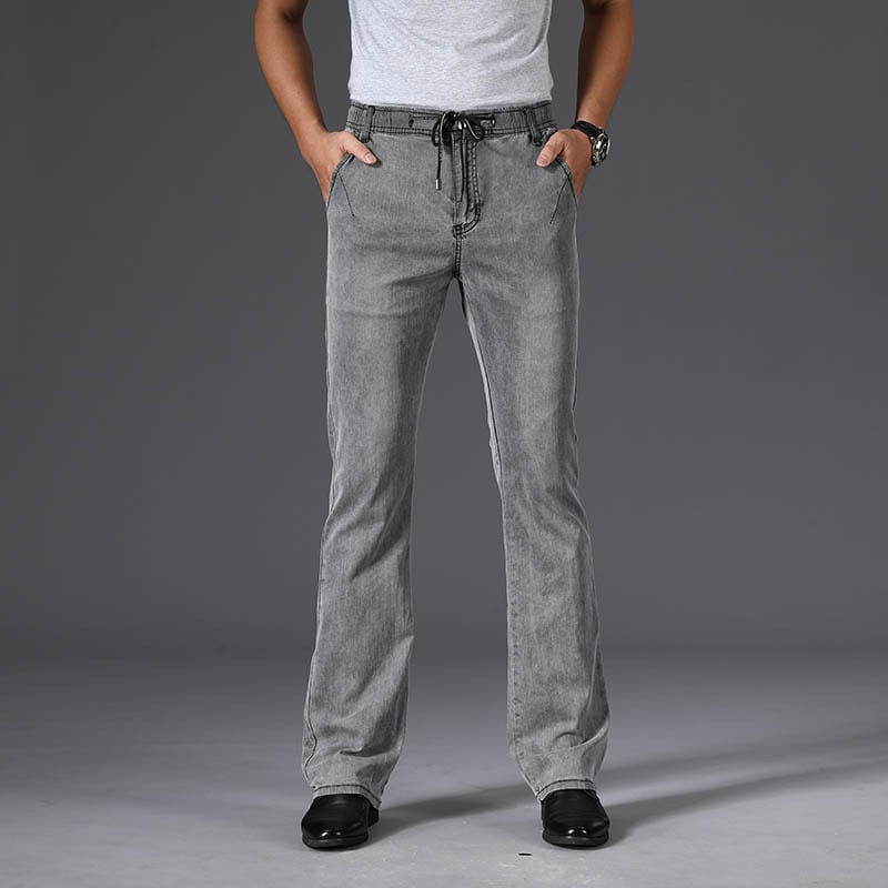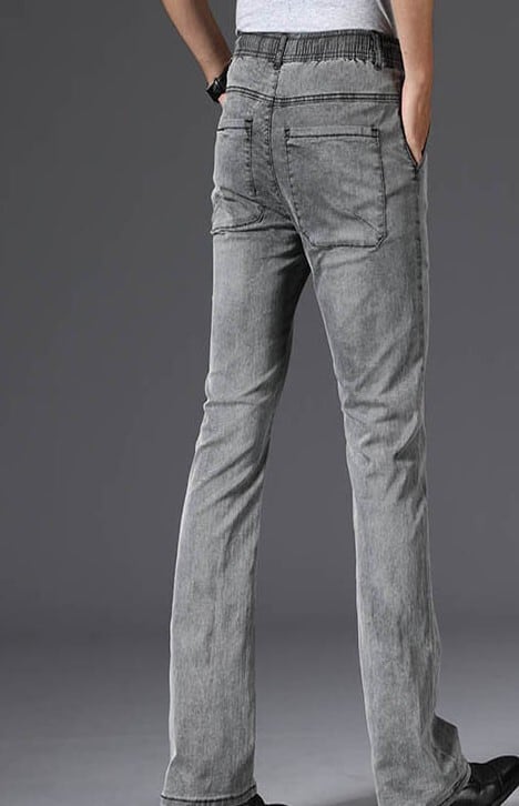 Vintage wash strap flare stretch denim