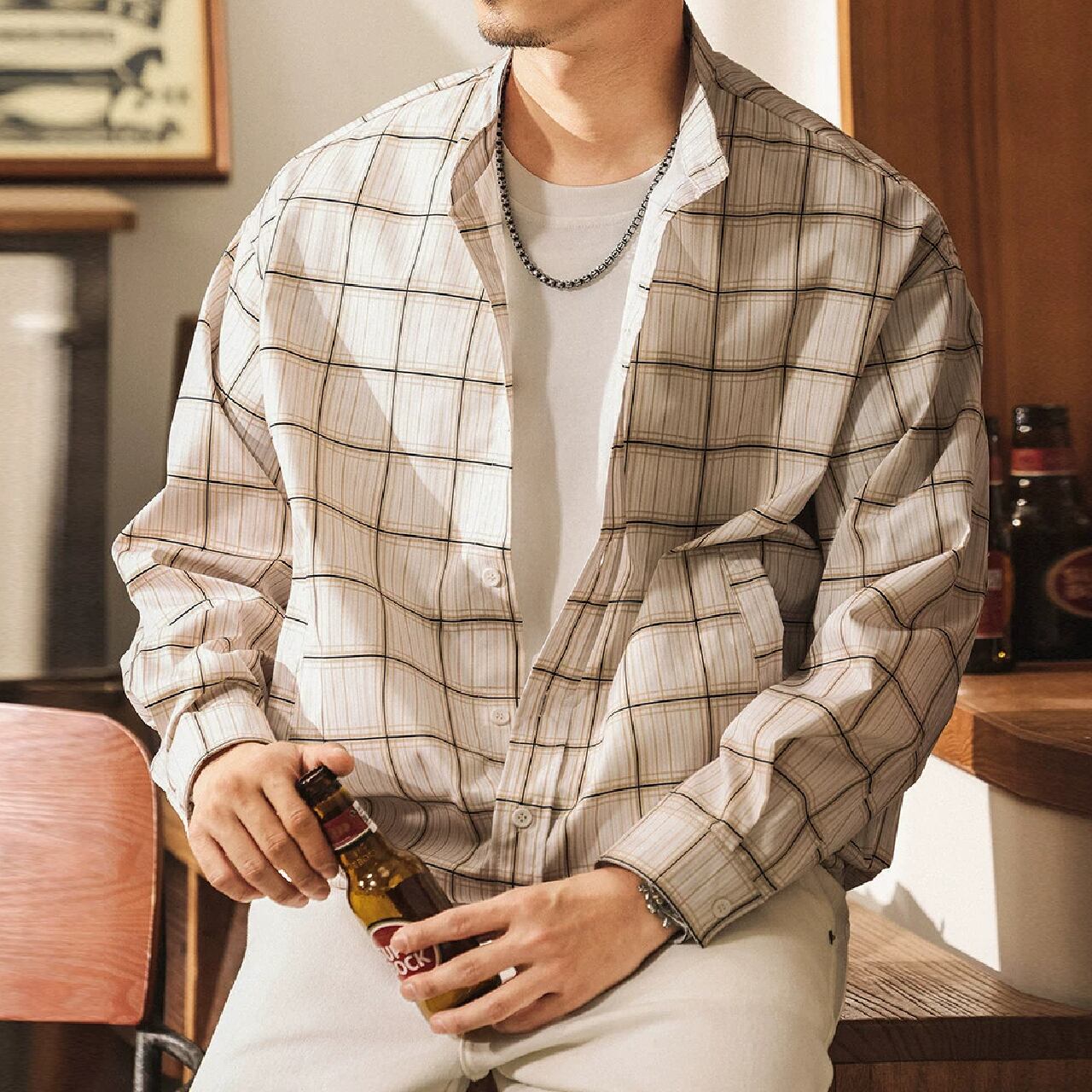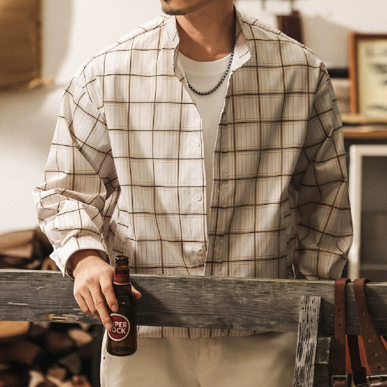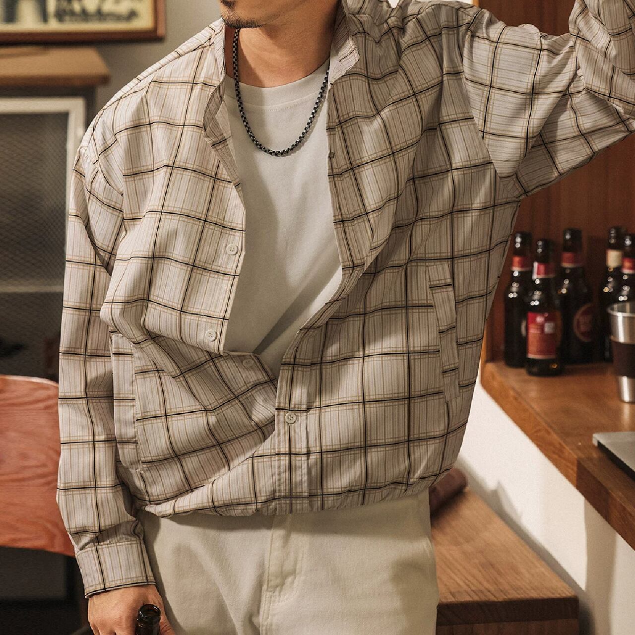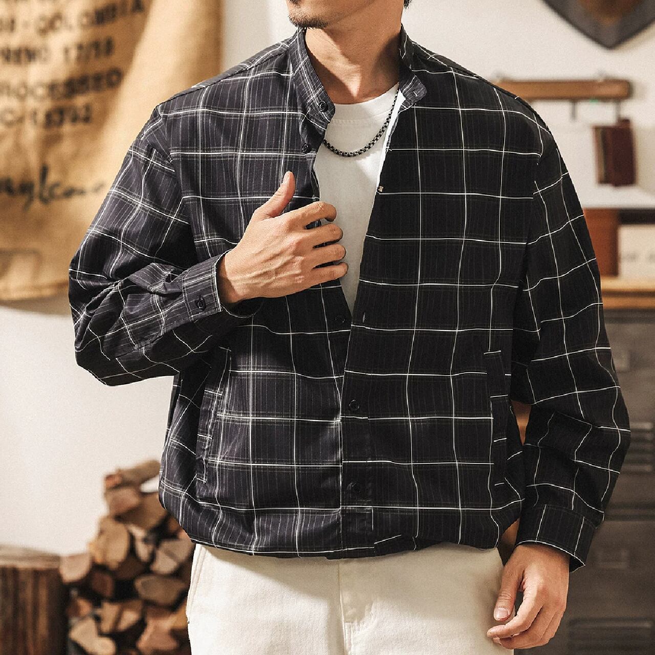 Stand collar two piece vintage check shirt ( 2color )